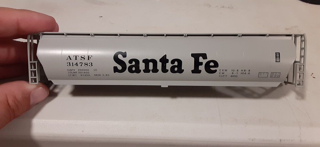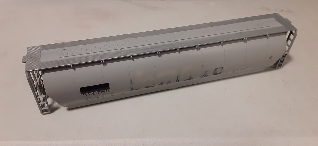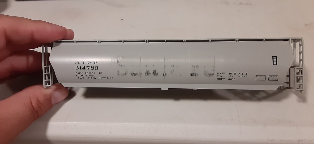 I started by using 800 grit sandpaper to sand down the large Santa Fe lettering. It didn’t take long to get through the lettering as Bachmann’s printing on their cars is thin. Working from the top down, I sanded off most of the lettering and in some areas went through the gray base paint which left random patches of the raw plastic car body in an off-whiteish color.