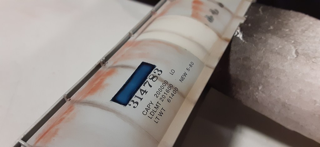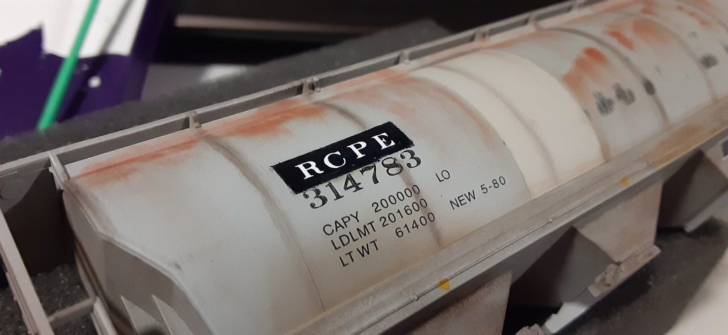 For the new reporting marks, I brushed Micro Gloss over both black patches and let it dry for around 12 hours. Using individual Microscale white letters I applied the RCPE reporting marks. This step offered an opportunity to more closely match the prototype where the stenciling is not square. Once the decals were placed and blotted, I brushed them with Solvaset and let the area cure for about 24 hours. I sealed the new lettering by brushing them over with a light coat of Micro Gloss then let dry for another 12 hours.