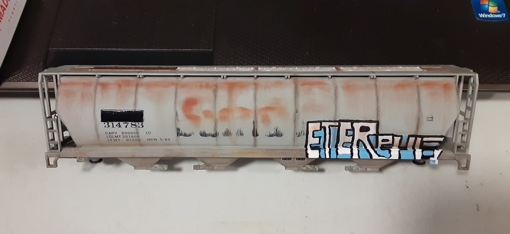 I hand painted the graffiti, while not based on any prototype image it’s just a basic arrangement of random large block letters. I used a pencil to draw an outline, traced the outline with an ultra-fine black Sharpie and filled them in with white craft paint on a fine microbrush. I used a sky-blue chalk marker to accent the letters. After about 20 minutes everything was dry enough to clean up the black Sharpie outline. I used the same ¾” brush to dust over the graffiti and soften the colors some.