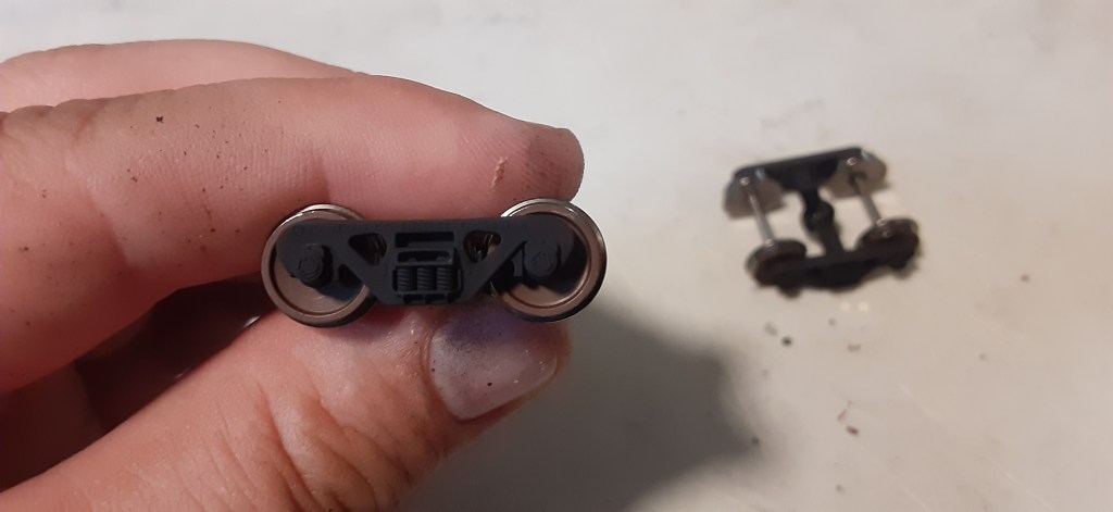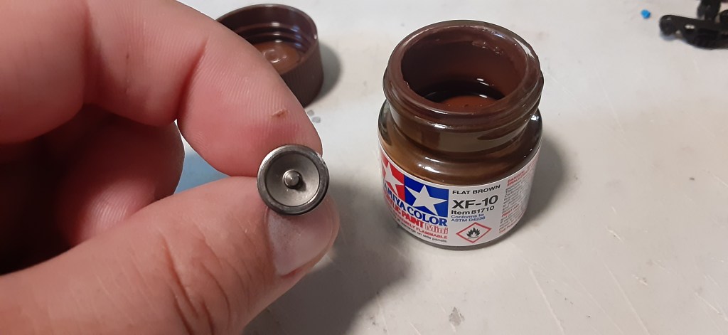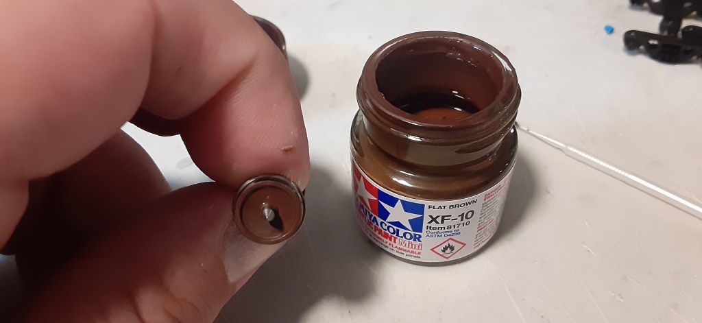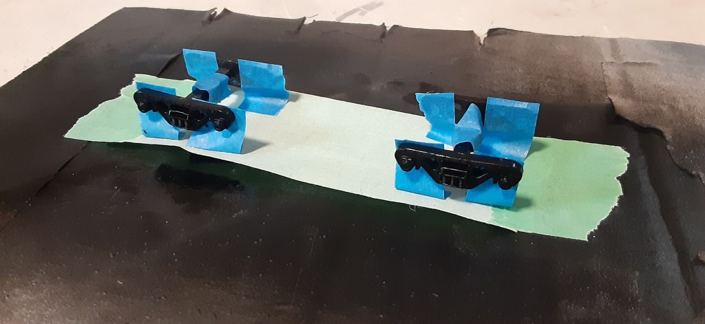 Starting out, disassembling the car is the easiest route. Using a micro brush to paint the wheel faces with flat brown makes this process a little quicker. I then masked off the back of both trucks and sprayed them with RustOleum ultra flat black from the camouflage line. While these smaller parts were drying I sprayed the entire car body with Tamiya flat clear and let dry. This was just about the right amount of time for the trucks and wheels to dry, I reassembled them and set aside.