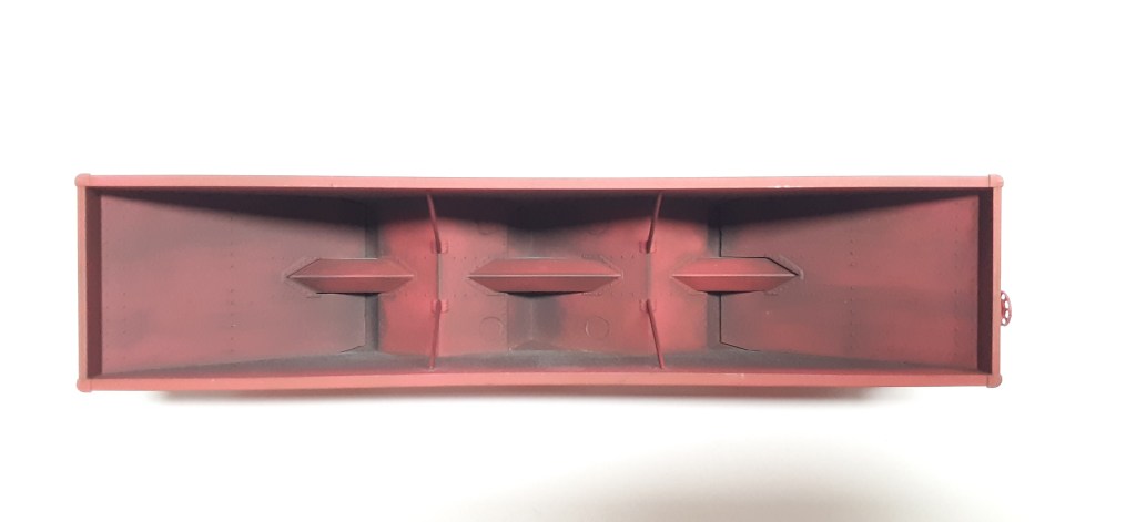 I followed the light sanding with brown panel line wash from Tamiya applied to both sides of each side rib and end braces as well. Once mostly dried, I highlighted the ribs by brushing dark earth powder by AIM horizontally across the car sides and ends to darken the ribs.