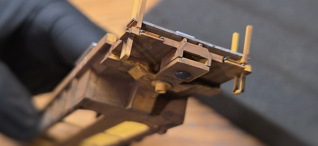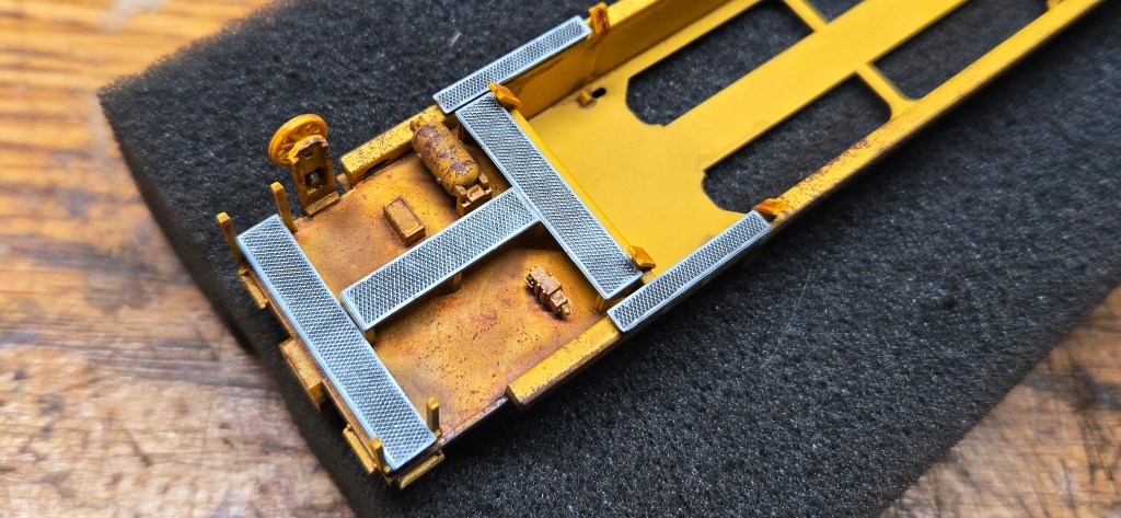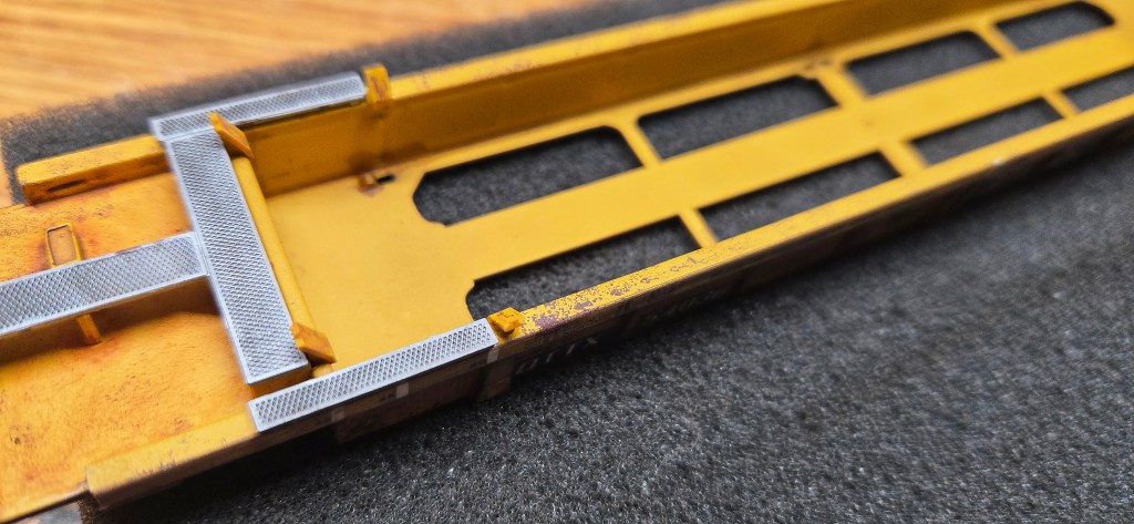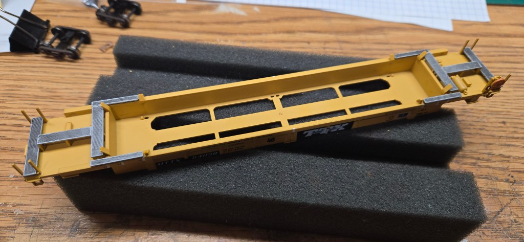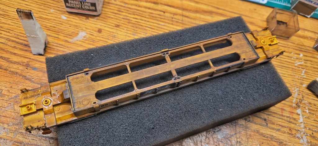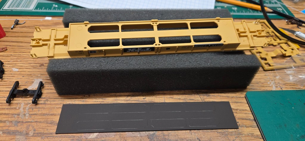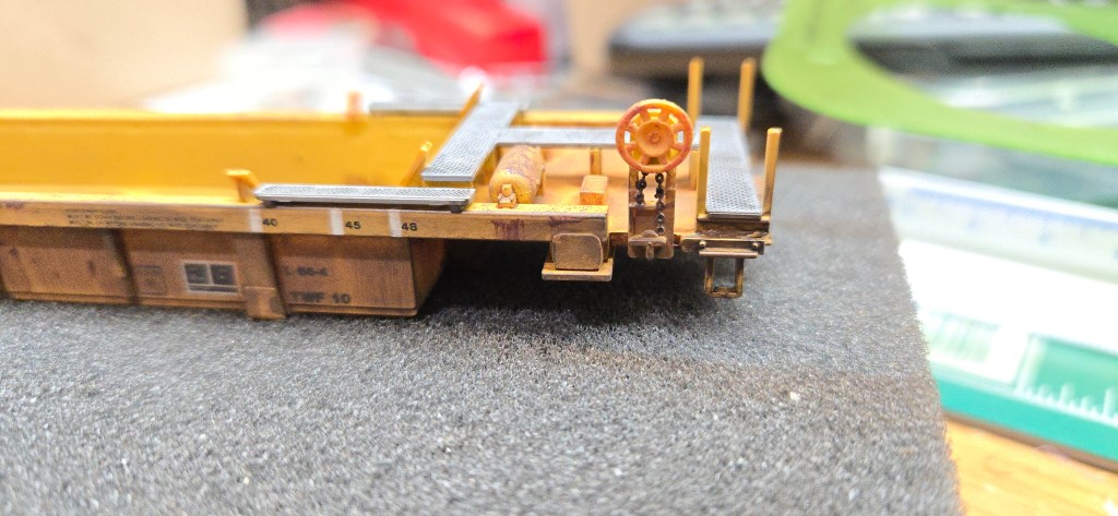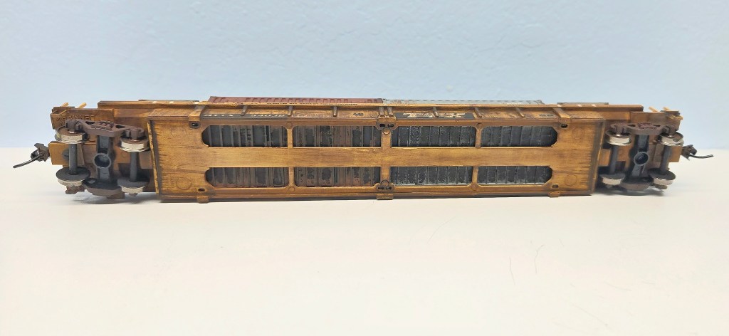 I chose to begin on the car’s underside since I decided not to use the weight that came with the kit. This was not my original plan, and in the photo below I had sprayed the weight a dark flat brown and traced the car body out with an idea to cut the slots in the metal. The end goal changed to model a more prototypically accurate car with two 20′ containers, which is where plan to weigh the containers came into play and to maintain the see-through well.