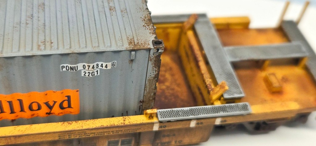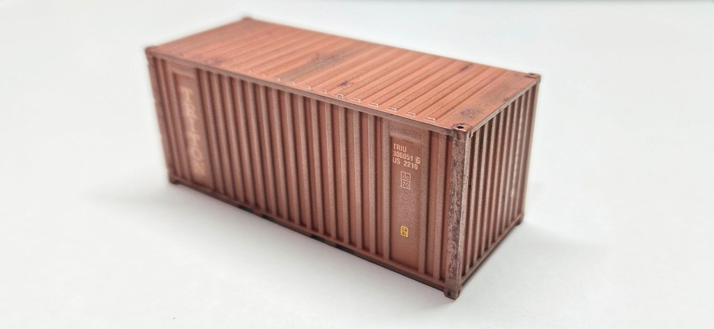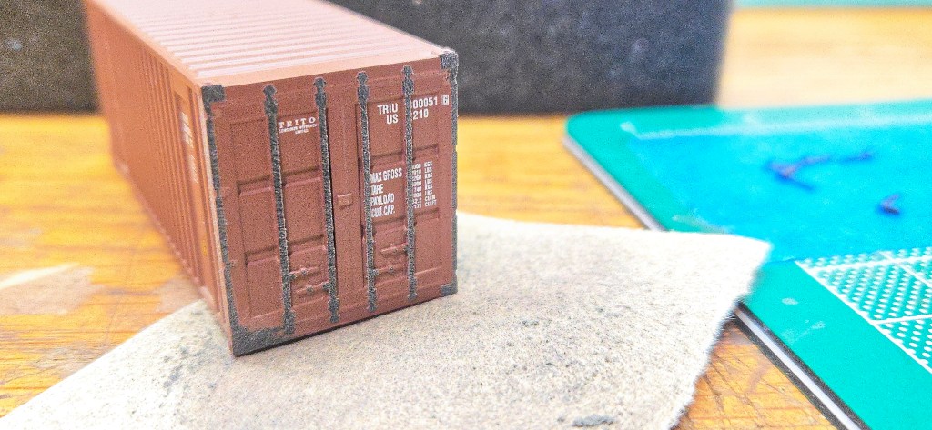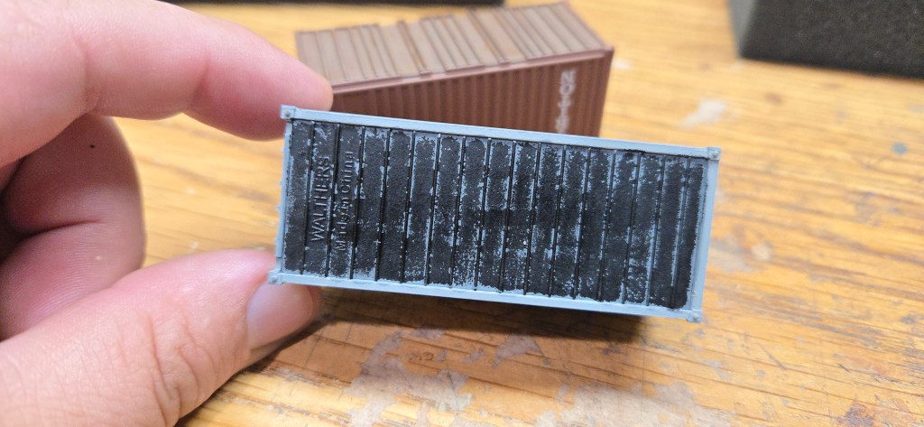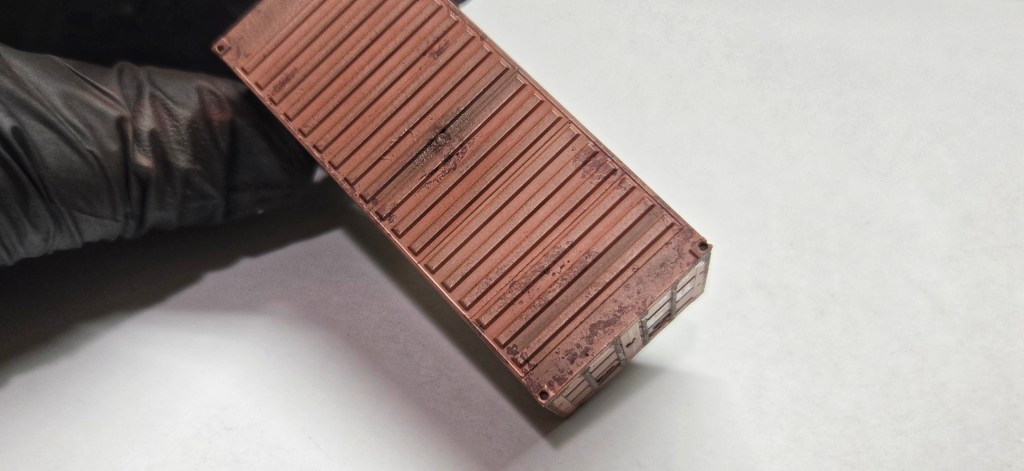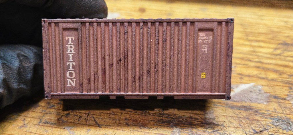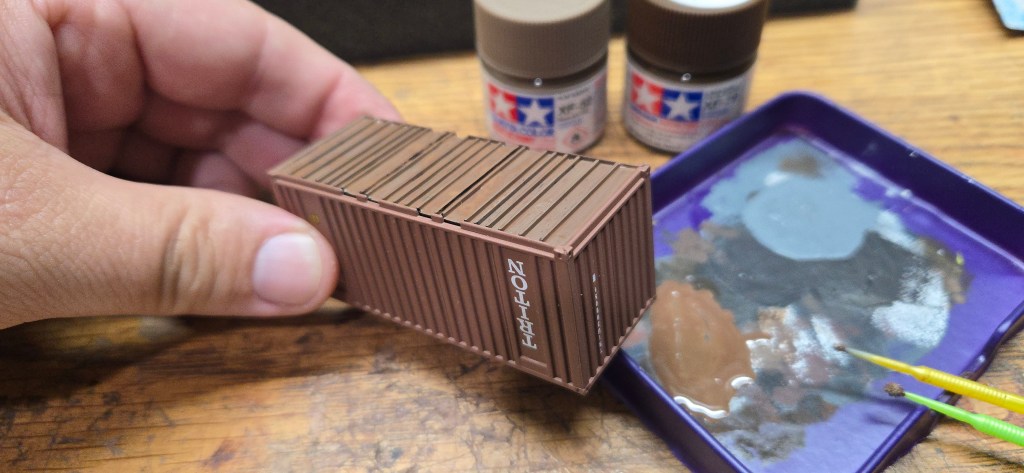 Next, I turned to weathering both containers. After looking at prototype pictures of similar ones, I tried to duplicate the colors and apply rust spots similarly to the photos.