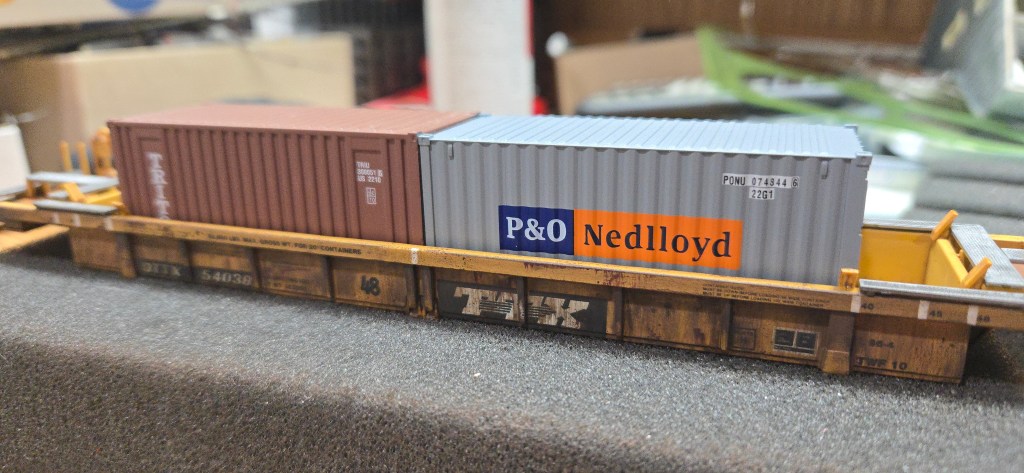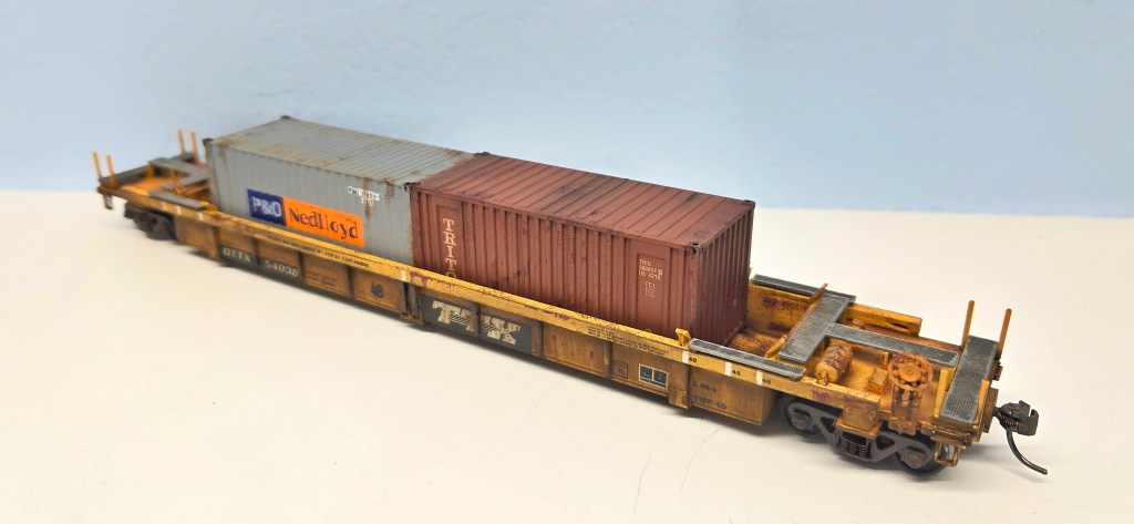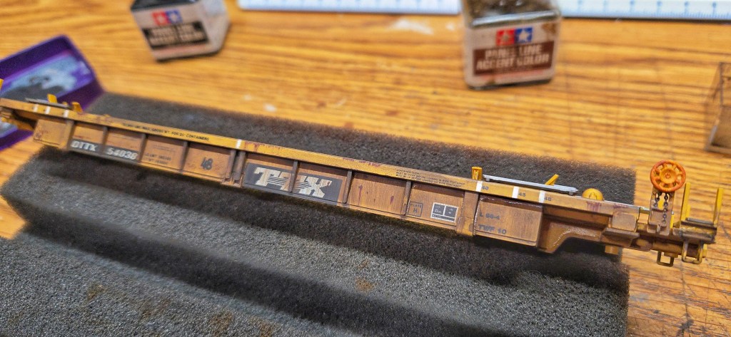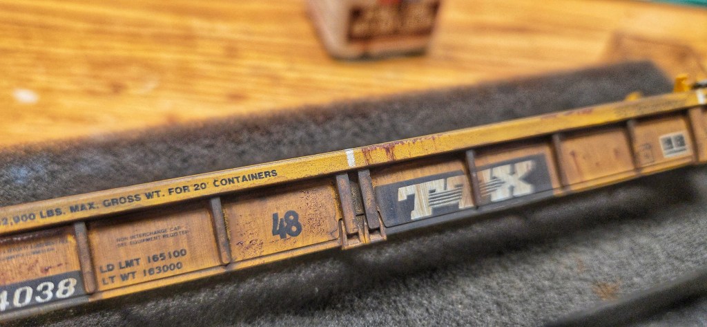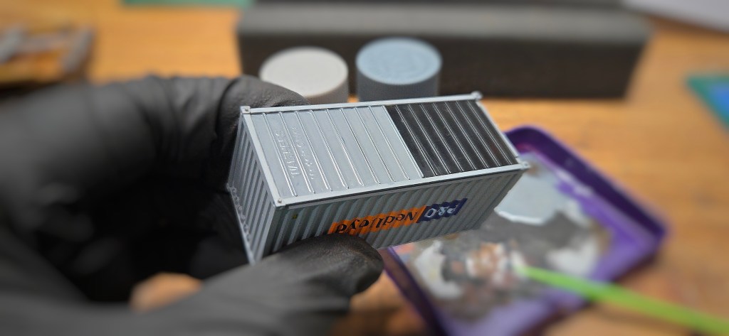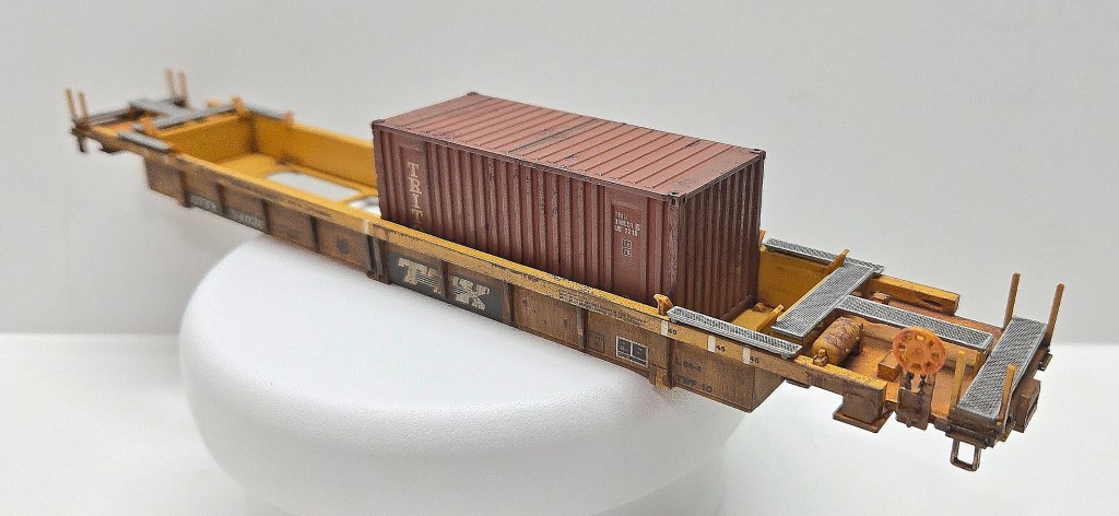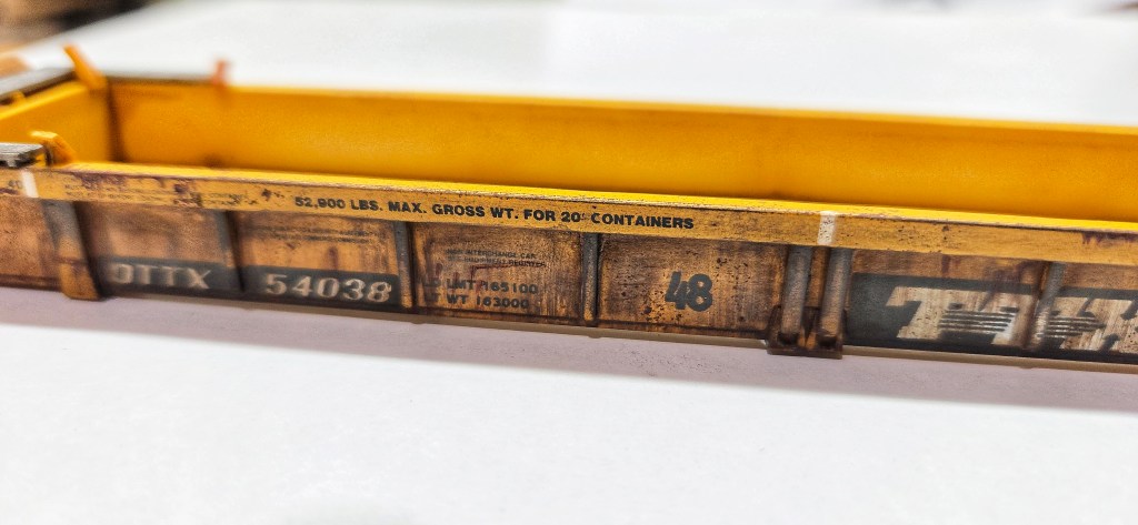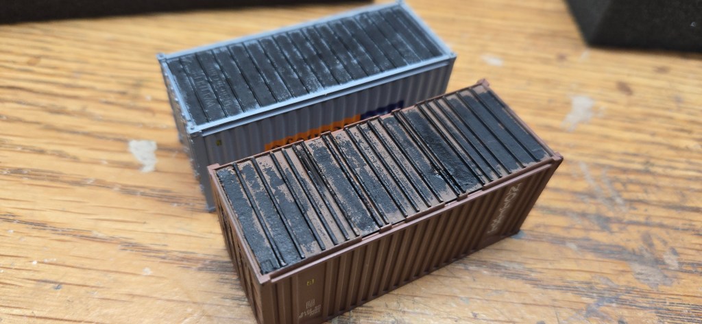 Next, I turned to weathering both containers. After looking at prototype pictures of similar ones, I tried to duplicate the colors and apply rust spots similarly to the photos.