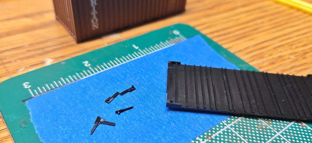 To get the containers to fit between the molded alignment chocks in the car I needed to gently flatten all the oversized end door details on the Athearn container. I worked slowly and gradually sanded off the small amount that was needed for a better fit.