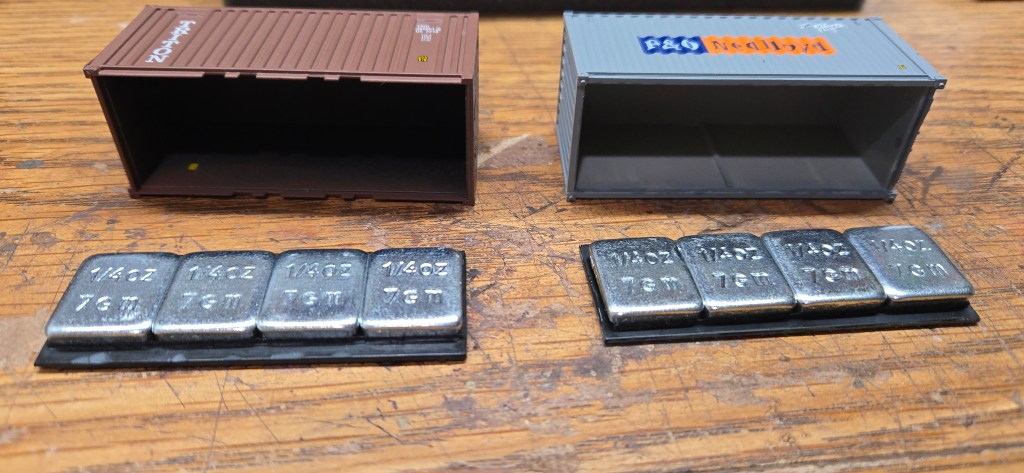 While the floors were removed I used some self-stick wheel weights to weight both containers, 1 ounce per.