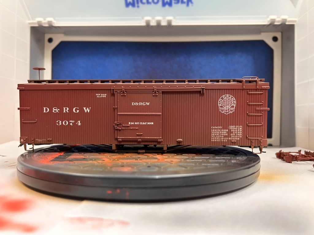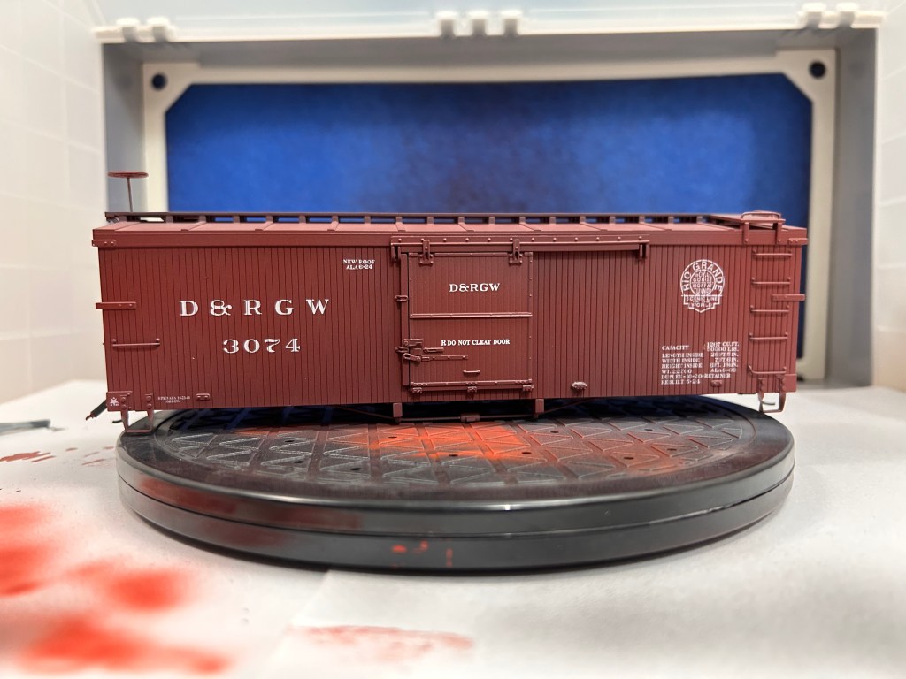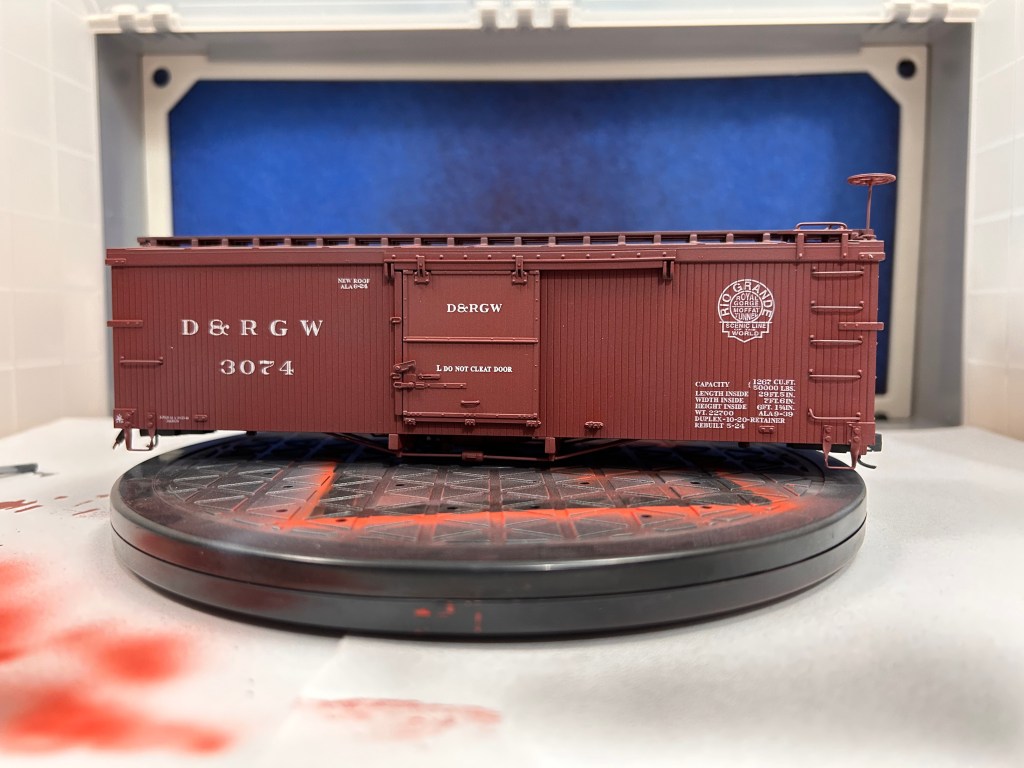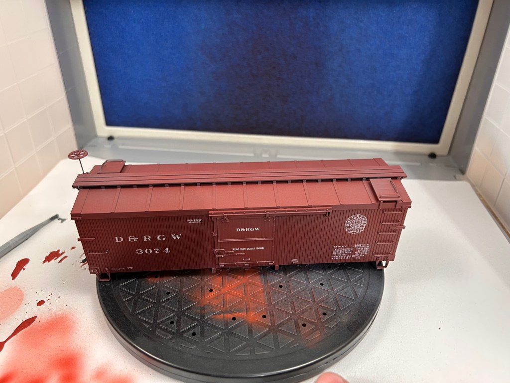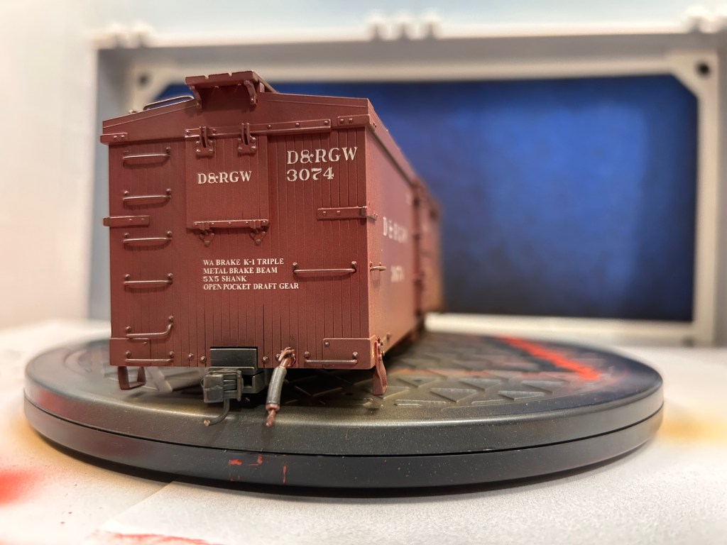 Of course, using an airbrush can feel intimidating. I was sure intimidated until I got the hang of the basics of painting with the air brush with a few practice runs. Confident enough in my skills, I decided up my game by weathering a piece of rolling stock. The model I chose is a 3000-series DRGW boxcar by Accucraft that is equipped to run on On30. These models are unique in the On30 market because they are scale-sized. Bachmann, the biggest name in On30, tends to undersize their equipment based on 3ft gauge prototypes and oversize their equipment based on 2ft gauge prototypes. While all their stuff plays well together, it also means very little of what they offer is the proper size. Head-on, Accucraft On30 cars look too wide for their gauge, but when viewed from the side it is hard to tell the difference between On30 and On3.