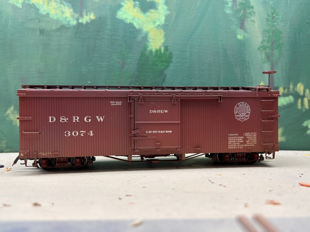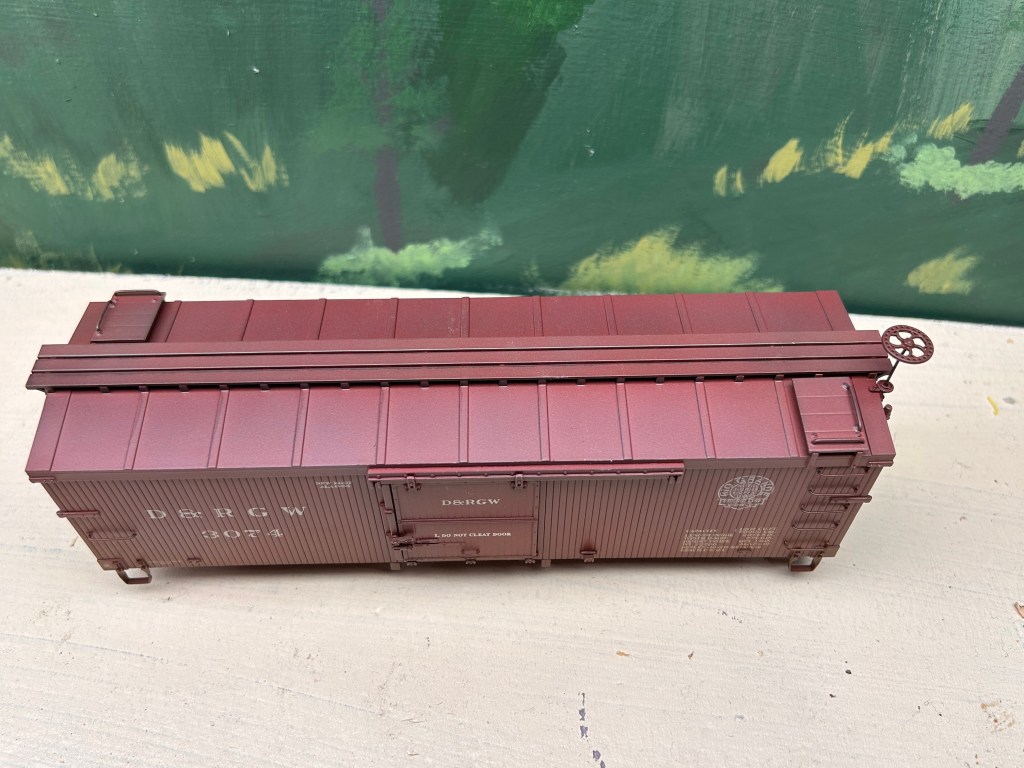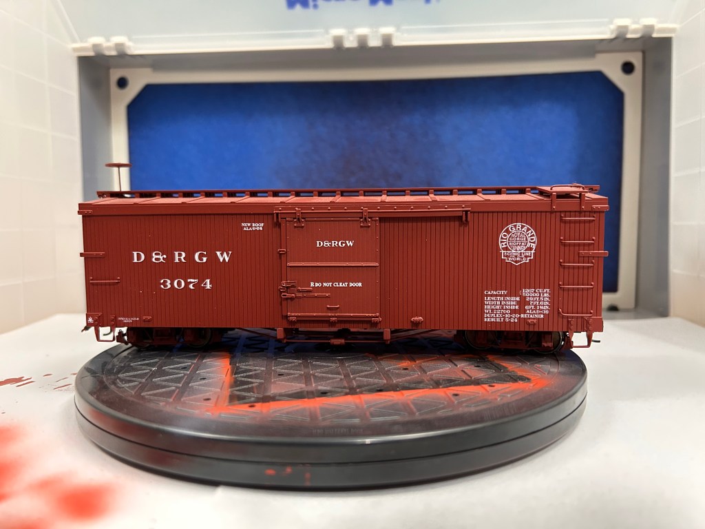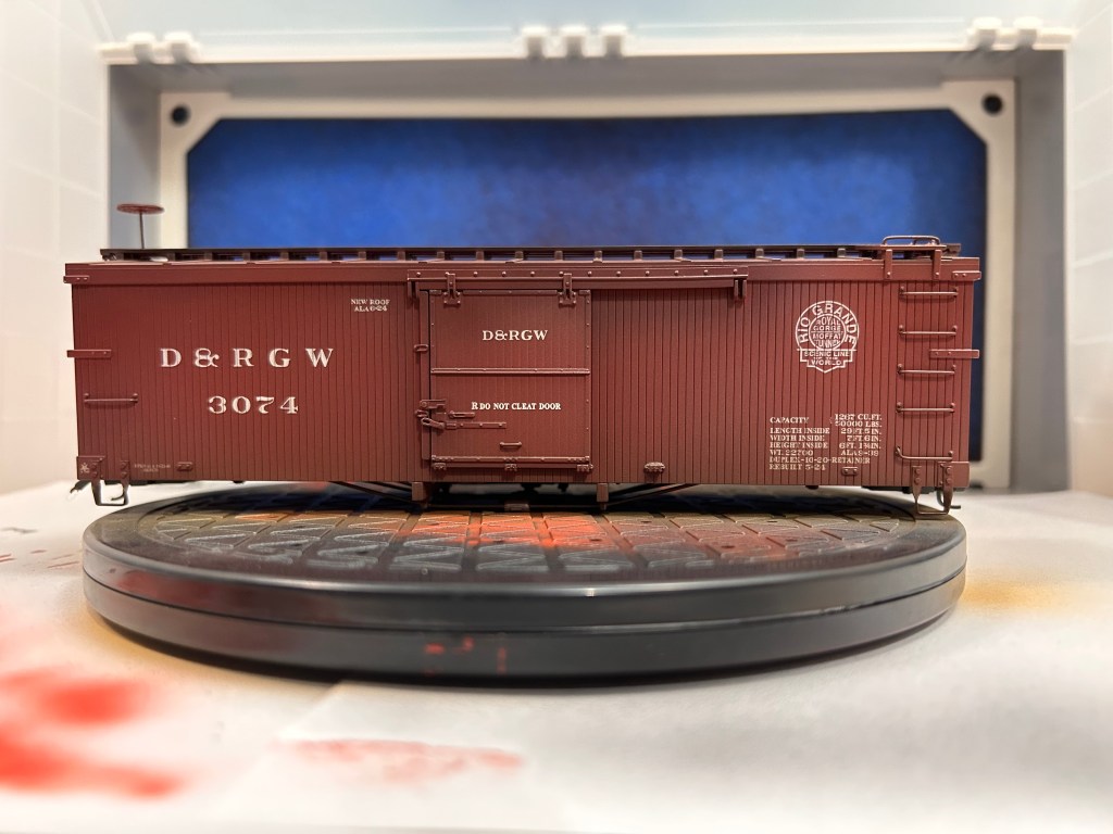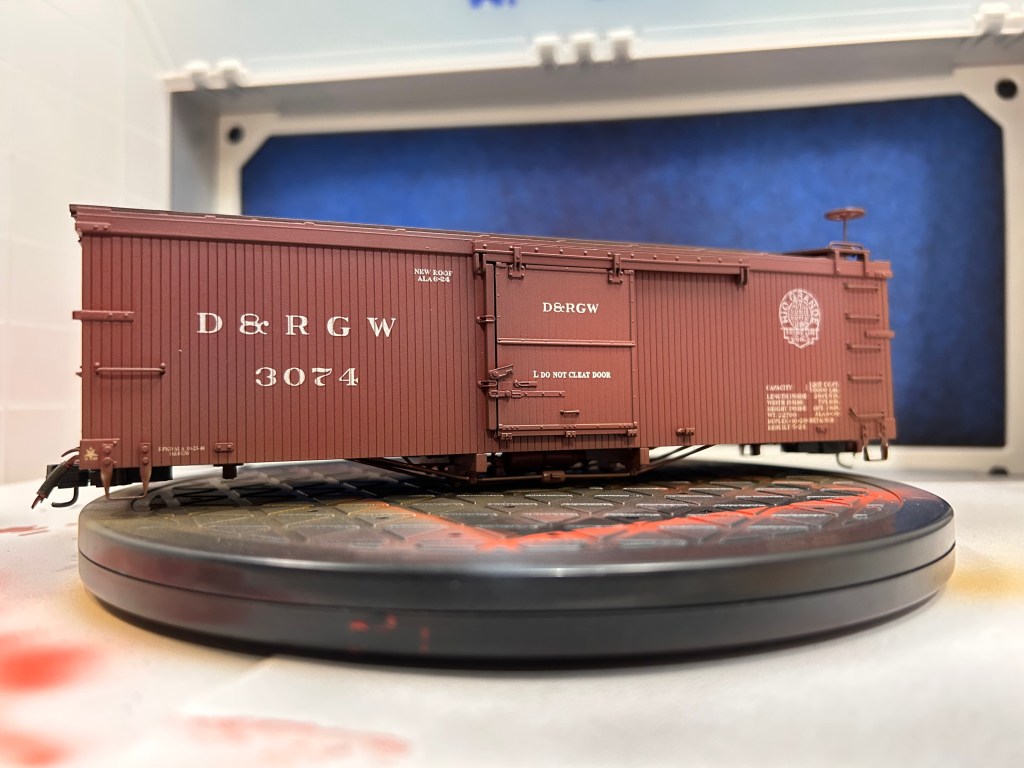 Of course, using an airbrush can feel intimidating. I was sure intimidated until I got the hang of the basics of painting with the air brush with a few practice runs. Confident enough in my skills, I decided up my game by weathering a piece of rolling stock. The model I chose is a 3000-series DRGW boxcar by Accucraft that is equipped to run on On30. These models are unique in the On30 market because they are scale-sized. Bachmann, the biggest name in On30, tends to undersize their equipment based on 3ft gauge prototypes and oversize their equipment based on 2ft gauge prototypes. While all their stuff plays well together, it also means very little of what they offer is the proper size. Head-on, Accucraft On30 cars look too wide for their gauge, but when viewed from the side it is hard to tell the difference between On30 and On3.