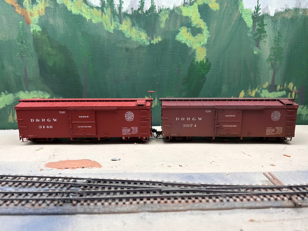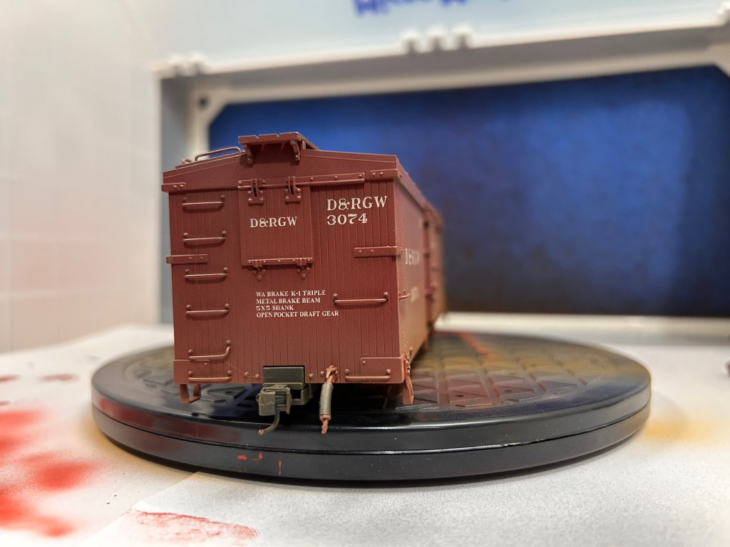 One way I deviate from a lot of modelers is painting the ends of the cars. General advice for model railroaders weathering their fleet is to apply a pair of streaks of mud up the ends of each car in line with the wheels. Why? Because when a train is moving at speed, any mud and dirt gets flung from the wheels of one car up the ends of adjacent cars. Narrow gauge trains don’t move that quick, though. A K-36 was limited to 35 mph by the DRGW. They could go a bit faster, but usually trains were doing 30-35mph on straight and level track and 15-20mph on gradients and sharp curves. Simply put, freight cars generally weren’t going fast enough to get brown streaks up the ends of each car. At those speeds, dirt tends to accumulate near the bottom third of the cars, which is where I am applying paint anyway.